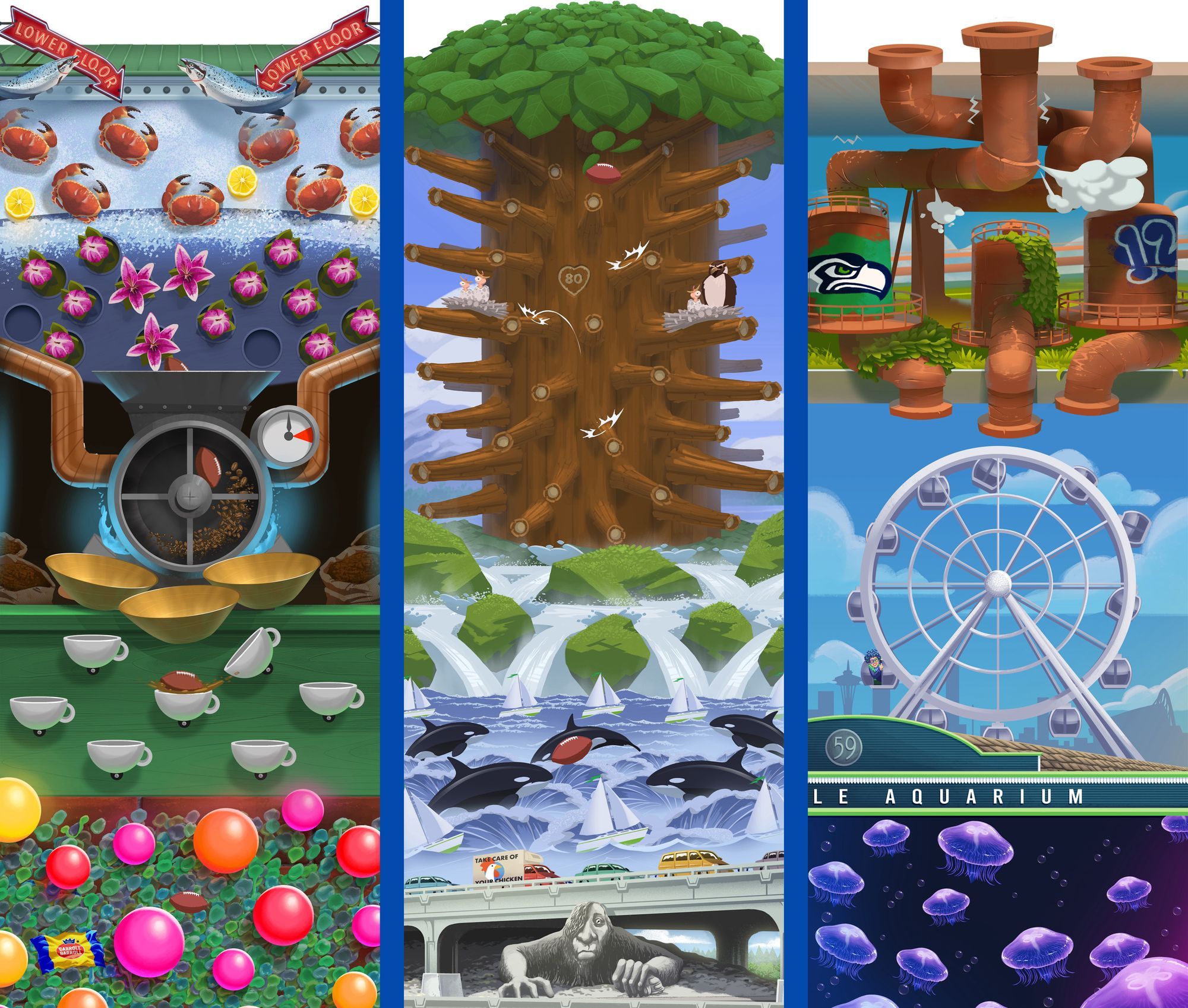 On on hand, our backgrounds were an ode to Seattle's most famous landmarks, like the Space Needle, the Fremont Troll, and the Gum Wall. But on the other, they also needed to be a functional game board with realistic interactivity between the ball and the background.