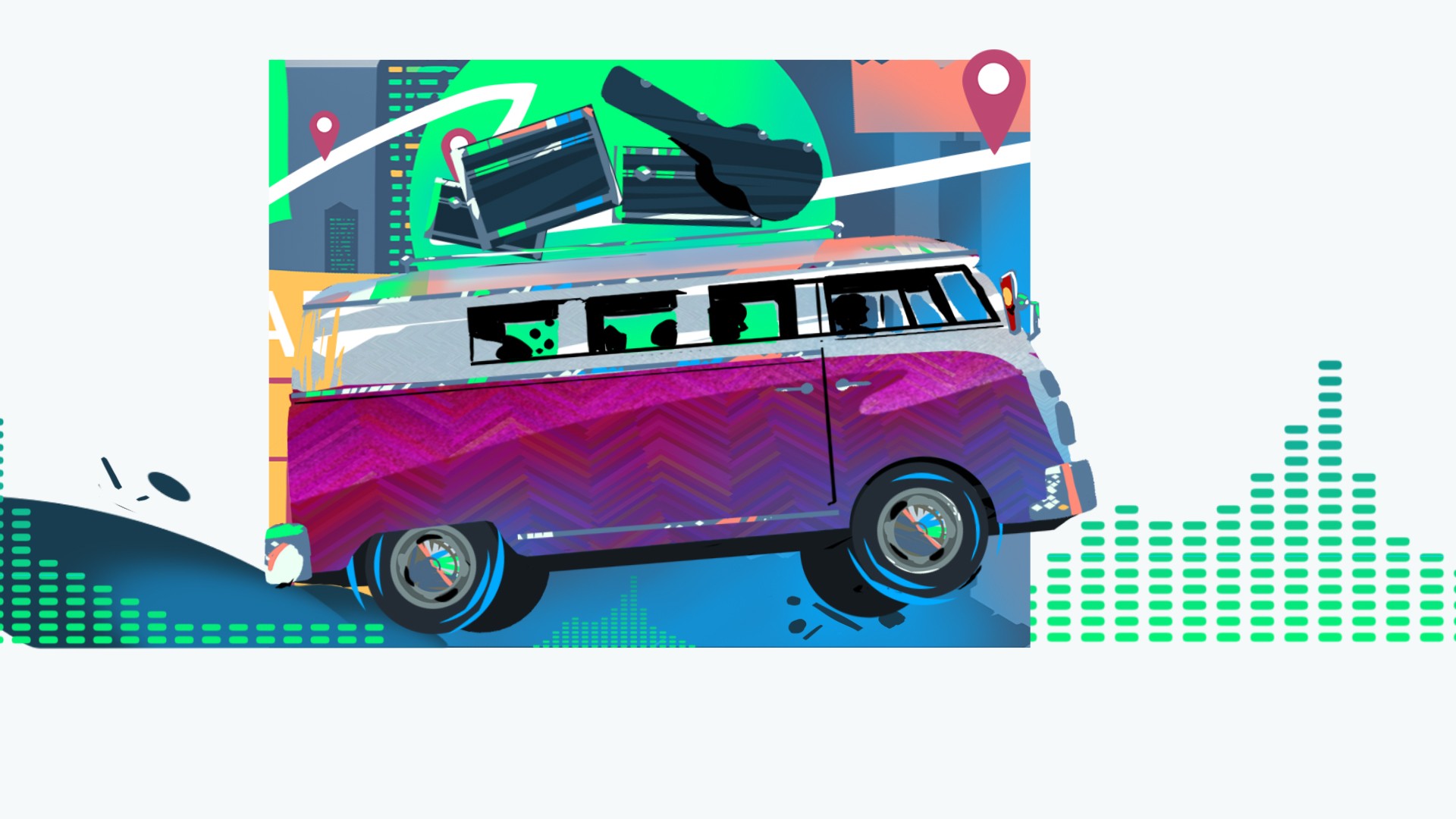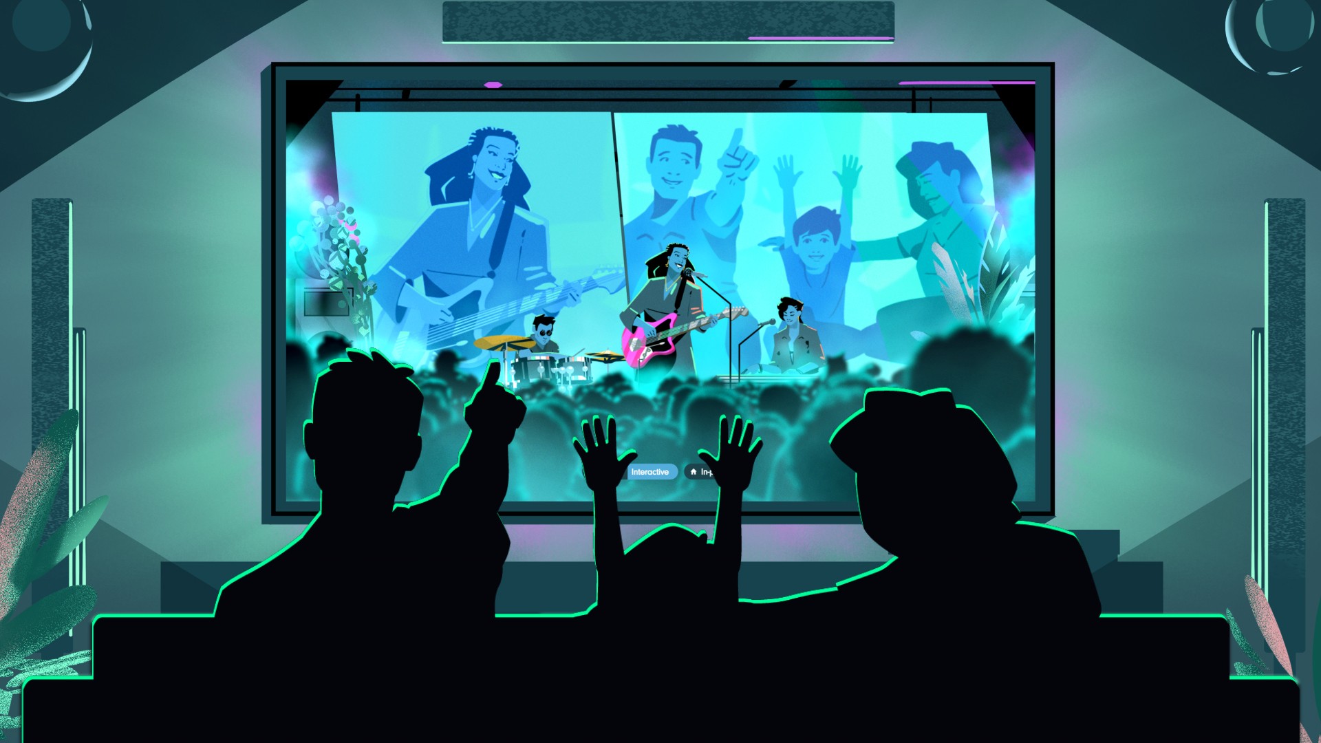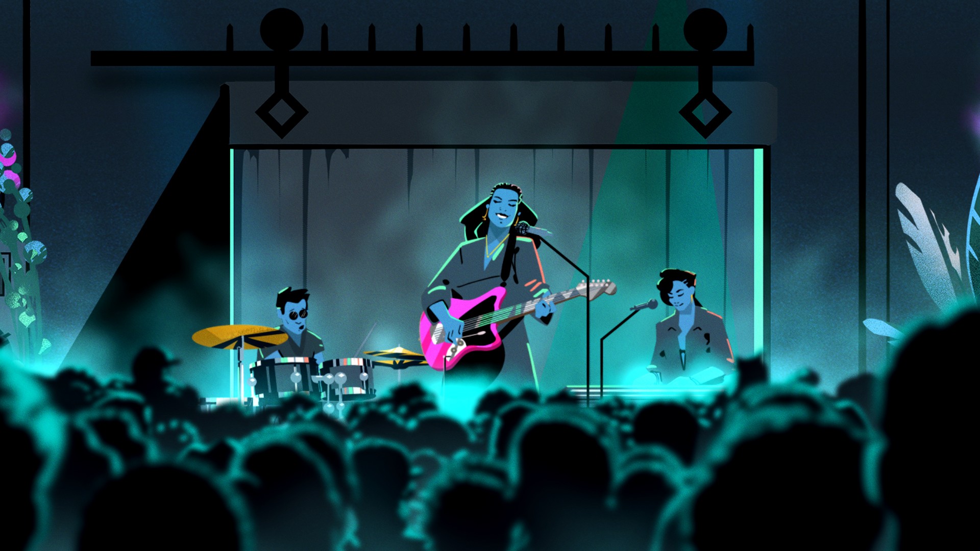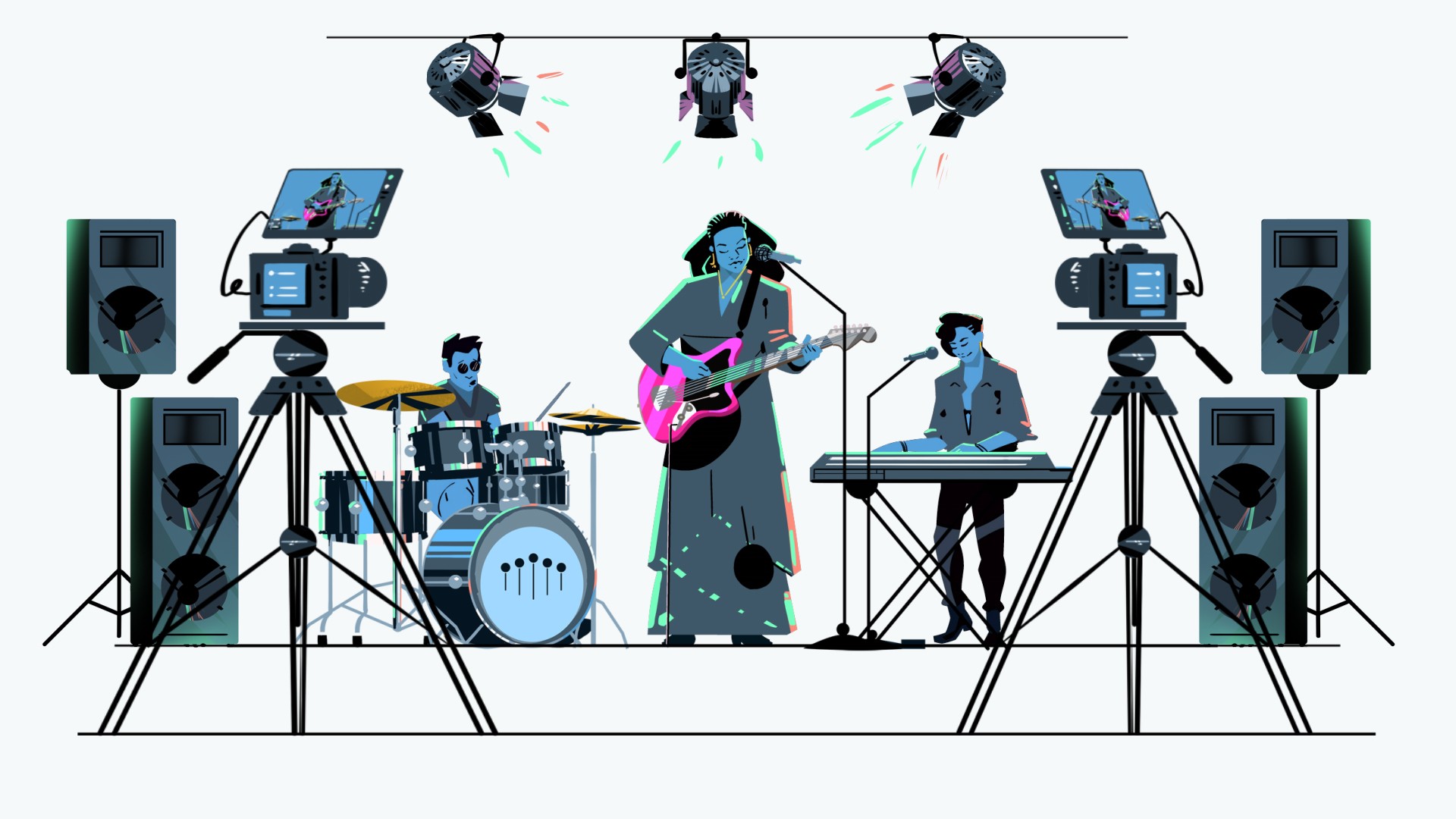 We transition by swiping from scene to scene, showing adapted UI, the band on tour, and the band in front of a live audience.
