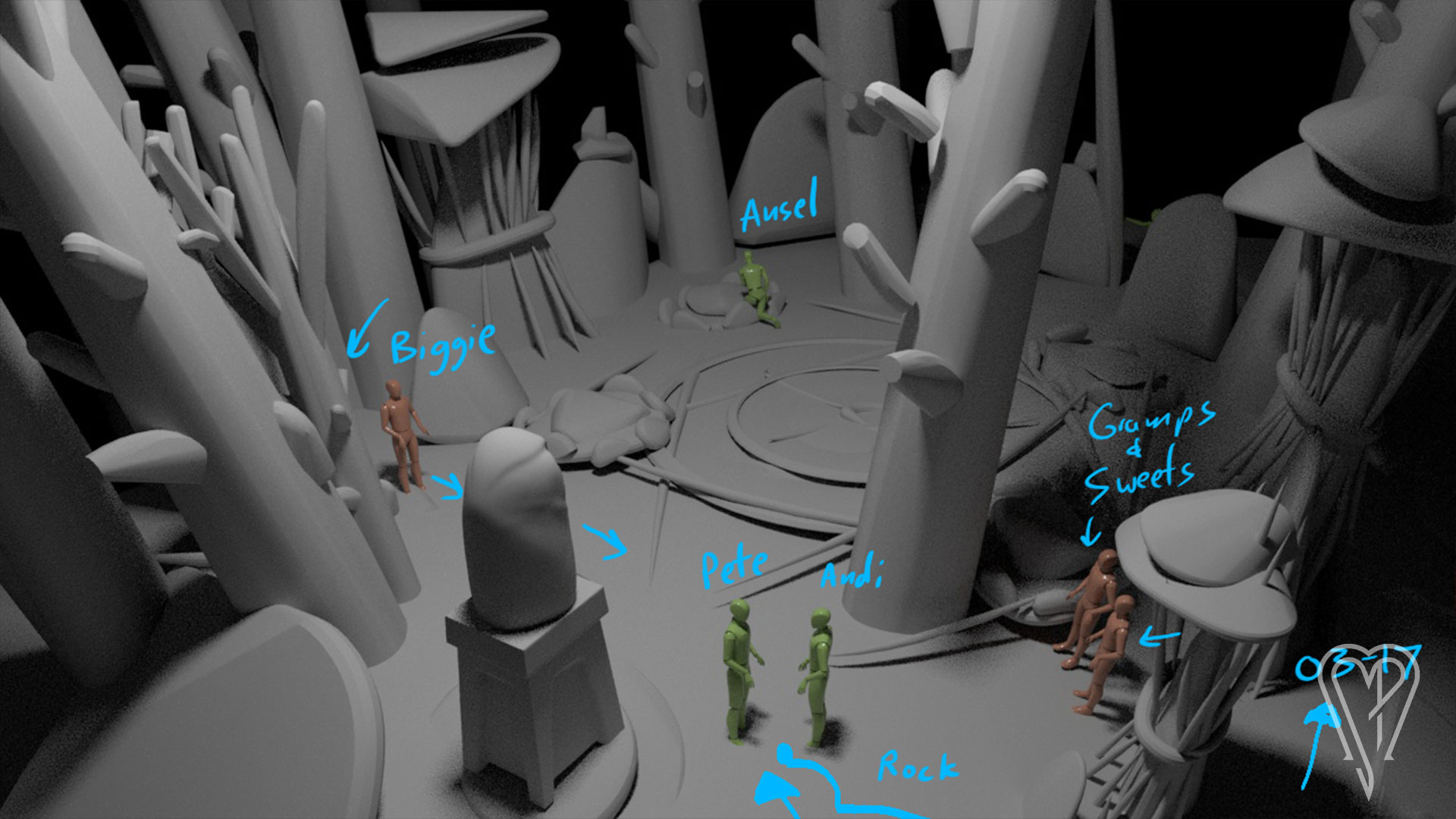 “I used Gravity Sketch on the Oculus Quest to block out environments in 3D and then set up cameras based on the storyboard. This helped the animators understand what the perspective was and where the ground plane was. That was kind of our bridge between animation and backgrounds. Once the environment is set up in 3D, you can set the camera anywhere and go, ‘Oh, you need reference for this shot, boom, done.’” – Deep Sky’s Creative Director Barret Thomson